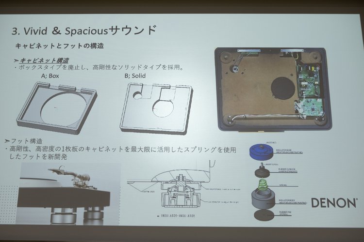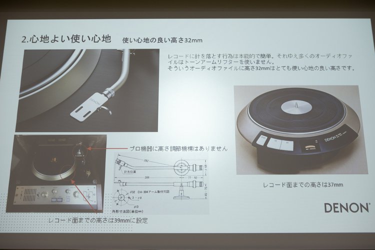 音決めはデノンのサウンドマスター・山内慎一氏が担当。「アナログが好きでデノンに入社したところがあるが、自身がアナログ製品に携わったのはこれまで2、3回くらいで、フルで携わったのは今回が初めて」「アナログプレーヤーではあるが、あくまで今のデノンの延長線上ということでVivid & Spaciousのフィロソフィーに基づきチューニングしている」と語る。