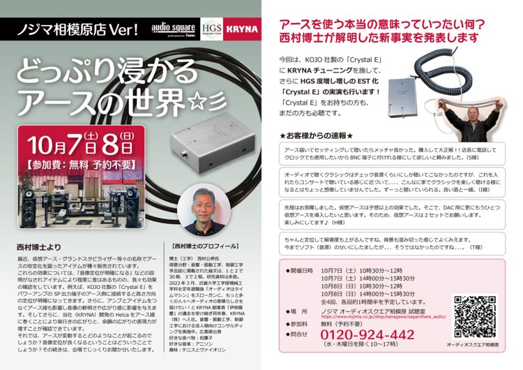 クライナでは、「仮想アース」「グラウンドスタビライザー」など、いま話題となっているアースの安定化を謳ったアイテムの効果と、それらを使うことの意味を来場者に体感してもらう試聴イベント、「どっぷり浸かるアースの世界」を10月7日(土)と8日(日)にノジマ オーディオスクエア相模原にて実施する。