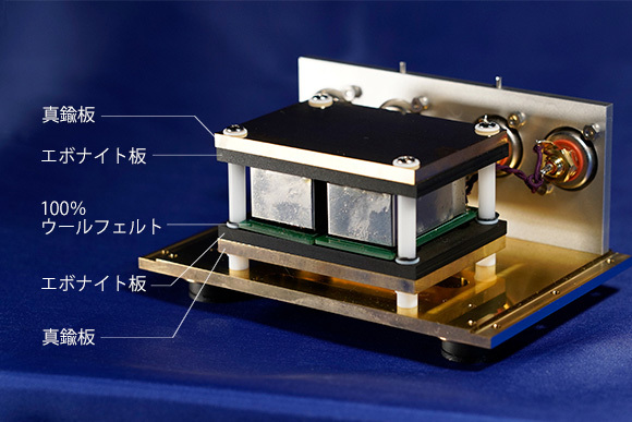 トランスへの振動の影響を避けるため、トランスを真鍮板とエボナイト板と100%天然ウールフェルトで挟み込み、さらに振動吸収効果の極めて高い制振ゴムを介してケースと固定している。ケース内は天然の100%メリノウールで満たすことで、静音化や内部配線剤の不要振動も抑制。脚部にも真鍮、エボナイト、制振ゴムを組み合わせた3層構造のインシュレーターを配して床からの振動の抑制を行うなど徹底した振動対策が施されている。