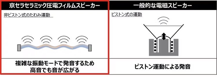 京セラが培ってきた圧電技術を応用し、圧電素子とフィルム、フレームを最適に組み合わせることで、面全体が振動して音を増幅する構造を開発したという。