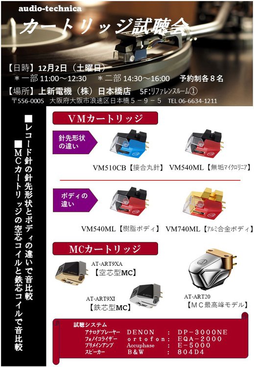 オーディオテクニカの各種カートリッジを聴き比べできるイベントが、12月2日(土)に大阪・日本橋のジョーシン日本橋店 5F Reference Room 1にて開催される。時間は11時からと14時半からの2部制で、予約優先で8席を用意する。