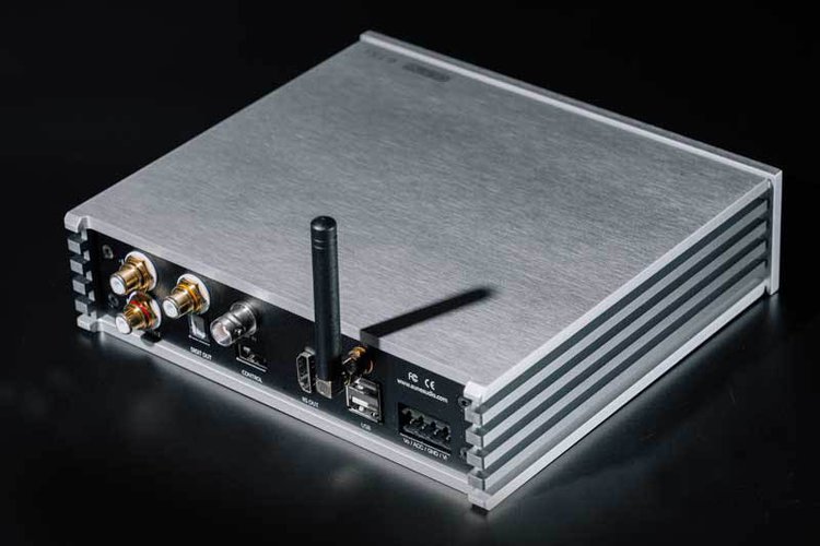 RCA出力2系統と、デジタル出力としてOPTICAL/COAXIAL/I2Sを装備する。IRワイヤレスリモコンとコントローラーパネルも付属。サイズは190W×168D×49Hmm。