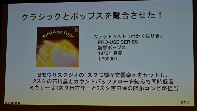 吉田 保氏は、東芝音楽工業録音部時代、行方洋一氏と共作した作品について語った。初共作は「ウルトラマンの歌」。実験的なスタジオ録音もチャレンジしており、1975年のプロ・ユースシリーズ「ツァラトストラはかく語りき」は、旧モウリスタジオの1スタに読売交響楽団が、2スタに「石川晶とカウント・バッファローズ」が入り、同録した作品。1スタは行方氏が、2スタは吉田氏が担当して録音したという。