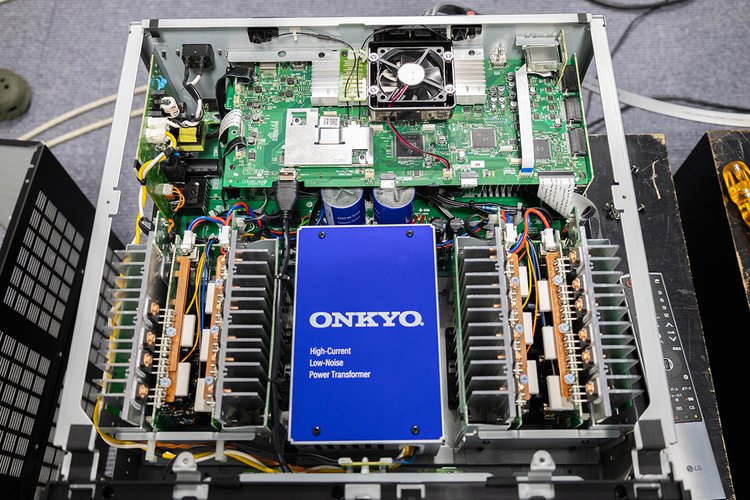 「TX-RZ70」の内部を見せてもらうと、手前中央にONKYOのロゴ入りの大型のトランスが設置されており、その左右に見えるヒートシンクがアンプ部となる。オンキヨーの伝統でもある「3段インバーテッドダーリントン構成」となっており、低インピーダンス、高電流出力を実現しているという。