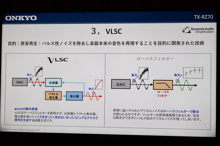 「ノンフェーズシフトアンプ」は、周波数帯域を広げることで、可聴帯域の位相ズレをなくす設計技術。「VLSC」はVector Linear Shaping Circuitryで、ローパスフィルターを使わずに、デジタルノイズを除去する技術となる。これらも長年のオンキヨーアンプ技術として培われてきたものとなる。