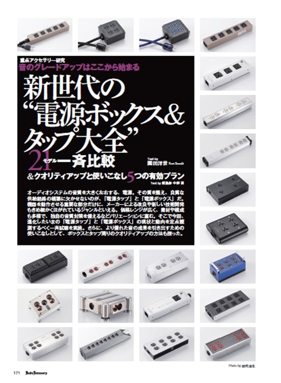 今号では、毎回好評を得るコーナー「重点アクセサリー研究」で、新世代の電源ボックス&タップ全21モデル一斉試聴と使いこなし術を掲載しています。