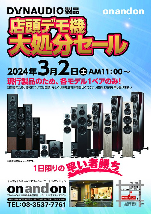 on and on、DYNAUDIOの店頭デモ機大処分セールを3/2に開催