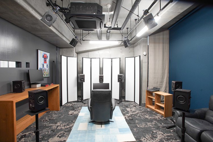 ラウンジはゲストルームやインタビュー撮影などにも使用できるスペース。7.1.4chの立体音響にも対応したシステムも構築されており、立体音響の音声ミックスルームとしても使用できる。