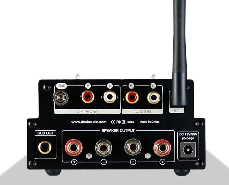 背面端子にはスピーカーOUTのほか、MM型フォノ/AUDIO IN/SUBウーファー端子を備える。さらにBluetoothチップ「QCC3008」の搭載で、Bluetooth 5.0規格でスマートフォンなどの各デバイスとのワイヤレス接続をサポートする。外形寸法は118W×132H×208Dmm、質量は約0.85g。