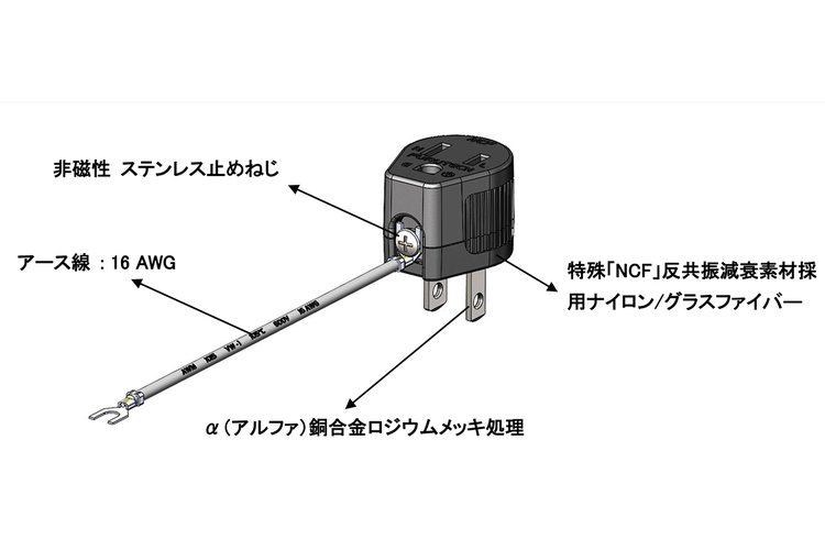 FI-PA NCF(R)の本体は、ナイロン/グラスファイバーにナノサイズのセラミックパウダー、カーボンパウダー、NCFを調合。導体部はロジウムメッキを施したα銅合金、止めねじは非磁性のステンレスで、振動対策と静電対策が施されている。また16AWGのアース線も同梱されている。アース線は、音質面からコンセントのアース端子もしくは仮想アース機器の端子に接続しての使用を推奨している。