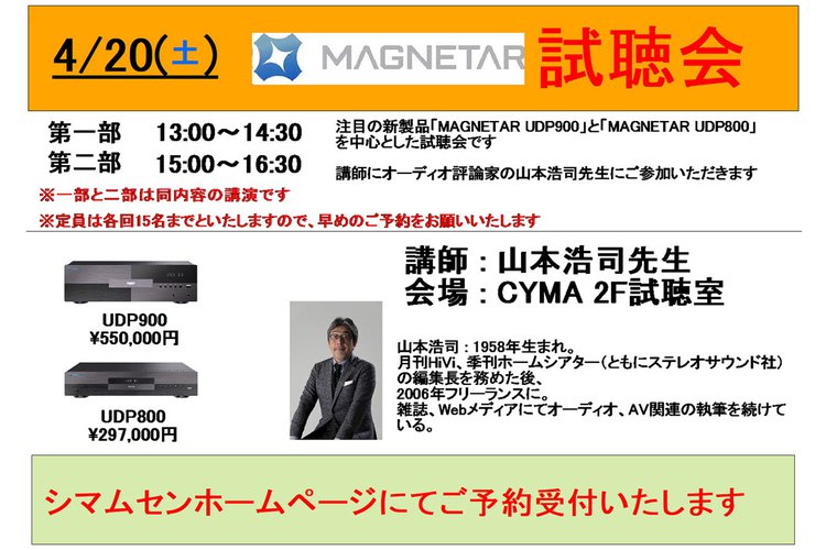 MAGNETARのハイエンド・ユニバーサルプレーヤー「UDP900」「UDP800」の試聴会を、4月20日に大阪・日本橋のオーディオショップ シマムセンのCYMA試聴室にて開催する。事前予約制で、入場は無料。