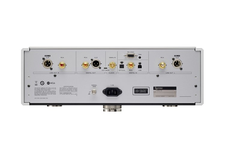 入力端子はRCA×1、光デジタル×1、USB Type-B×1を搭載。D/Aコンバーターとしても使用可能で、最大384kHz/32bitのPCMと最大22.5MHzのDSDに対応する。アナログ出力端子はXLR/ESL-A×1、RCA×1。デジタル出力端子はXLR×1、RCA×1を搭載する。また、独自の電流伝送方式「ES-LINK Analog」も装備する。