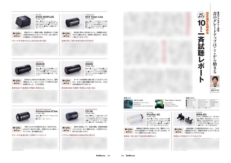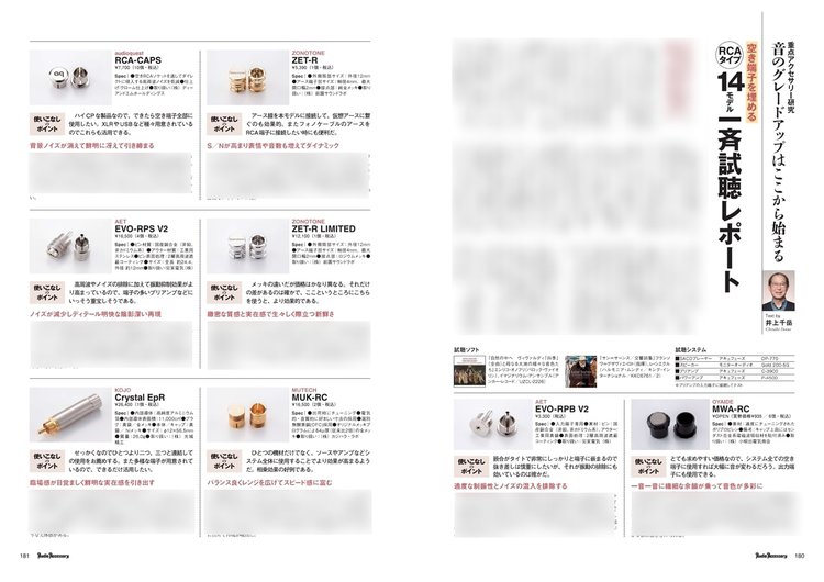 内容は、RCA入力・出力端子に使うモデルを14機種、ACコンセントプラグの空き端子に接続するタイプの10モデルを一同に集めて比較試聴を行っています。RCAタイプは井上千岳氏、ACコンセントタイプを炭山アキラ氏の2名のテスターが実施。ご自身のシステムに合った、製品選びの参考にしていただければ幸いです。
