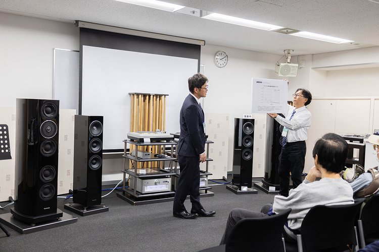 テクニクスのブースでは「SL-1200GR2」を中心に、技術者による解説とレコード再生を交互に実施する。モータードライブ「ΔΣ-Drive」に新たに投入した技術など、テクニクスならではの確かな基礎研究に裏打ちされた音質のポイントを解説。テクニクスとランボルギーニとのコラボプレーヤーにも来場者の熱い視線が注がれていた。
