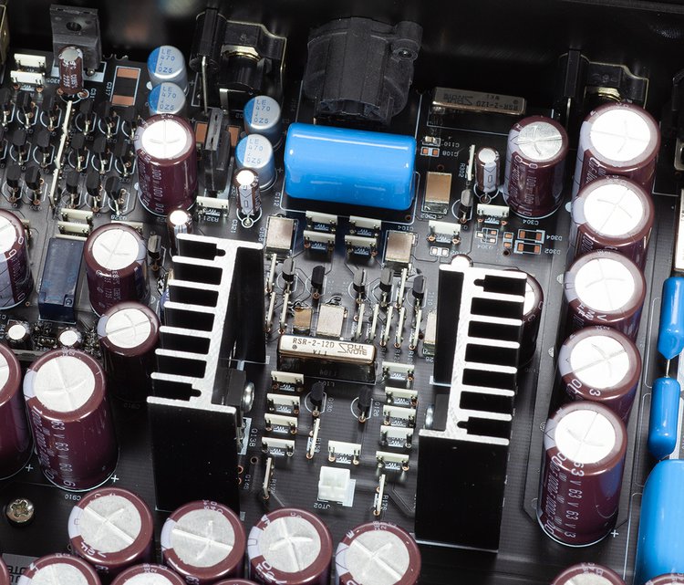 整流コンデンサーには、高耐圧小容量低倍率箔フィルターコンデンサーを選別して搭載。使用本数で容量を最適化、電源トランスの負荷を軽減することで、電源トランスの実質レギュレーションをさらに向上させたという。整流ダイオードには、許容突入電流値が強化された最新スペックのSiCダイオードを採用した。