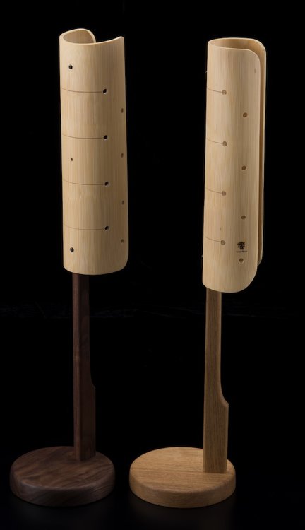 同モデルは、先に発売されたルームチューニングアイテム「Harmonic Speaker 空」に続く第2弾として登場したもの。「Harmonic Speaker 空」が左右スピーカーの間に設置して音場の中に焦点を作り、音の実在感を狙った製品であるのに対し、今回の「Sound Mirror 響」は竹製の反射板に広葉樹製スタンドを取り付けたもの。