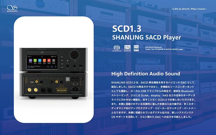 同ブースにて、SHANLINGブランドからは新作SACDプレーヤー「SCD1.3」を展示。MediaTek ME1389EEプレーヤーシステムと三洋電機製HD870ピックアップレーザーを搭載したトレイ型ドライブを採⽤、Hi-FiグレードなディスクメカニズムによってSACDのスムーズな読み込みとエラーフリーな再⽣を実現したという。