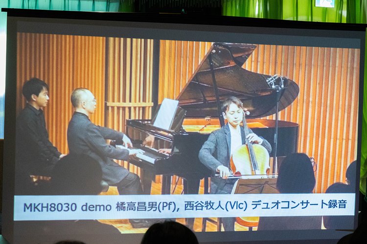 製品発表会では、洗足学園音楽大学の教員であり、レコーディングエンジニアの齋藤 峻さんが登場。MKH 8030を実際に使用して録音したチェロ&ピアノの音源を用いたデモンストレーションを行った。