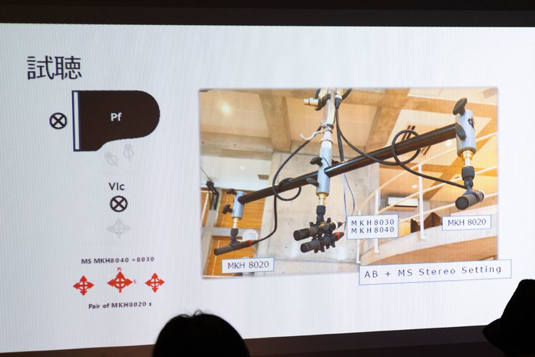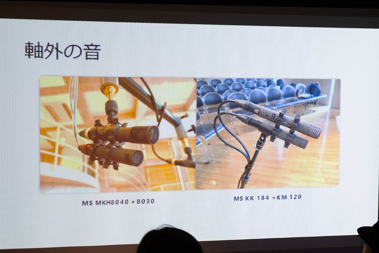 MS方式のほかに、よく採用されるスタイルとしてAB方式というものもあり、こちらは2本の無指向性マイクを約40cmから約2m程度平行に離して配置するもの。齋藤さんのデモでは、一回のレコーディングでAB方式(MKH 8020使用)とMS方式(MKH 8030&MHK8040使用)の両方を実践し、その音の聴き比べと言った実験的な取り組みも披露された。