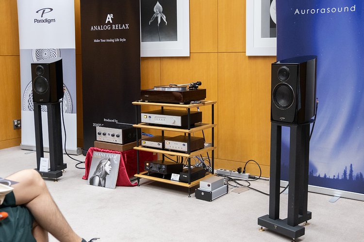 オーロラサウンドのブースでは、真空管のモノラルパワーアンプ「PADA-300B」やプリメインアンプ「HFSA-01」、“VIDAシリーズ”フォノイコライザー、THORENSのアナログプレーヤー、アナログリラックスのカートリッジ、パラダイムのスピーカーによるアナログ再生システムを展開していた。
