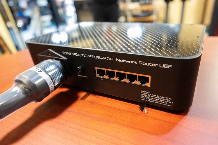 Network Router UEFは無線アクセスポイントをもたない、有線のみで使用できるルーターである。Synergistic Researchの特徴は、独自の「EMセル」と呼ばれる電磁波シールド技術にあり、高周波ノイズを効果的に排除する、と解説されている。他にもネットワーク関連製品として、スイッチングハブ「Ethernet Switch UEF」やネットワークプレーヤー「Voodoo」なども展開している。