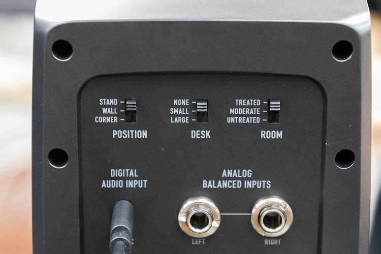 スピーカーの背面にはDSPによる補正スイッチを搭載しており、設置場所によって音質を追い込むこともできる。デスクトップ設置用のスタンドが付属するほか、底面には3/8インチネジ穴があり、汎用のマイクスタンドにも取り付けが可能。