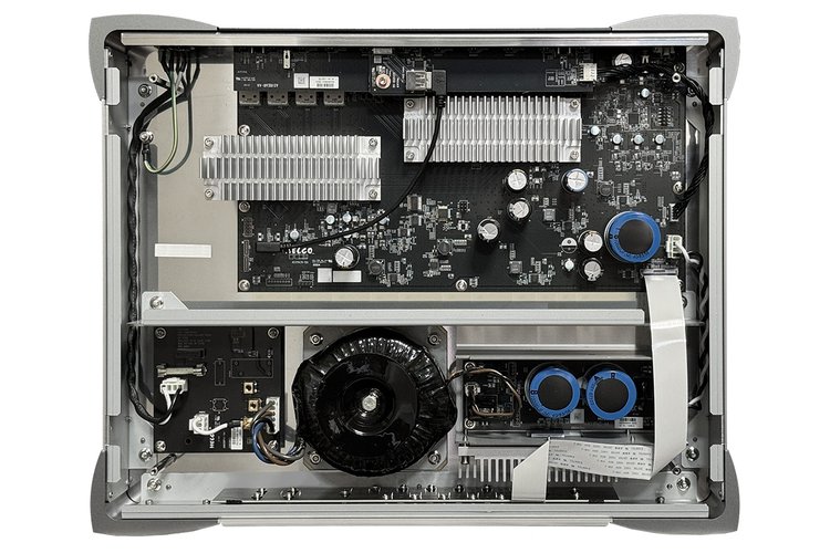 また、同ブランドのネットワークスイッチ製品としては初のフルサイズ筐体を採用。3mm厚のステンレスシャーシに、四隅ブロックや厚みのあるアルミ天板を組み合わせた2重構造を、底面のインシュレーターで支持している。