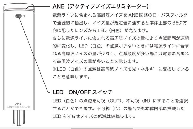 LEDランプの点滅の頻度によって高周波ノイズ量を目視で確認することができ、また点滅する光はスイッチによって消灯が可能。消灯状態でも筐体内部では発光が行われるため、ノイズ除去機能は継続されるという。