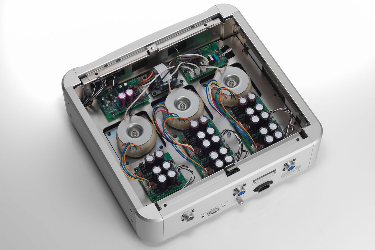 また複数枚の鋼板を使用したマルチレイヤ―構造も採用。各回路コンポーネントを個別のレイヤーに固定し、物理的・電気的な相互干渉を最小限に抑えている。電源部も、電源回路とトランスをマウントするレイヤーを分離させることで、トランスからの振動を回路に伝わらないような設計が施されている。