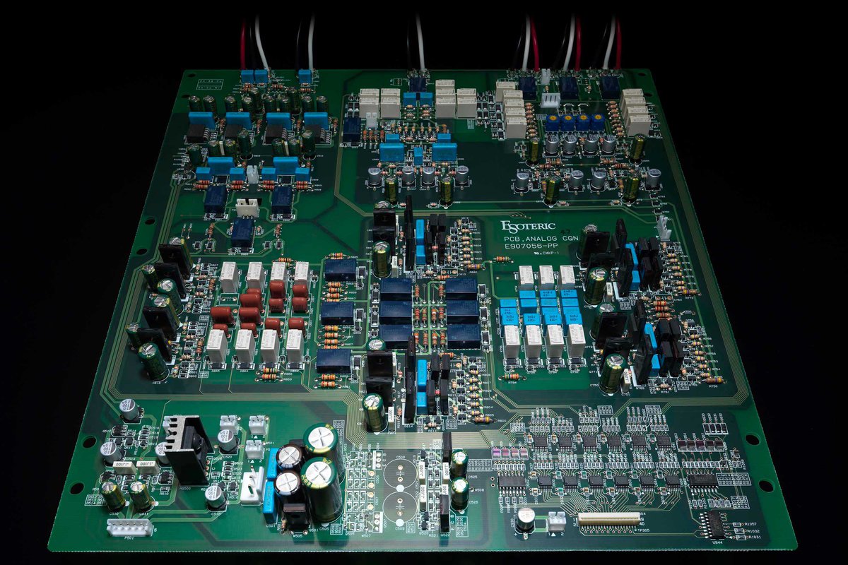 出力バッファーアンプは、フラグシップ・プリアンプ「Grandioso C1X」のノウハウを踏襲しており、2,000V/μsのスルーレートを誇る「ESOTERIC-HCLD(High Current Line Driver)」を、1つの信号ラインに対してパラレル構成で搭載する。