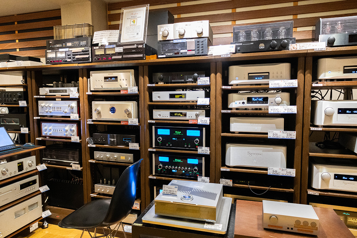 メインビルの1Fはおもに中古販売、2Fは中核価格帯の製品/アクセサリーとホームシアター、3Fはハイエンドな価格帯が中心となる。国産/海外ブランドの両方を扱うが、特に人気があるのはアキュフェーズ、そしてラックスマンやエソテリックといった国産ブランドである。