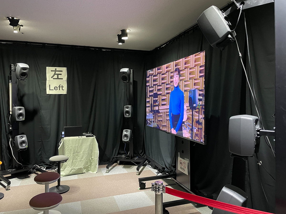 ゲストは動画の音をスピーカーで聴くとともに、イヤホンを通しても聴く。すると動画の中の人物が左右に移動するとその方向からその人物の音声が聴こえてくる。前後に移動してもその通りに立体音響として聴こえてくる。そしてイヤホンを外すと立体音響の効果は消えて普通のスピーカーの音声になる。