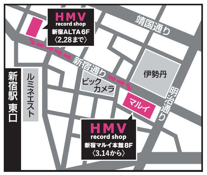 テナントである新宿ALTAが2月28日をもって閉館することに伴うもので、現在の店舗も同日で一時閉店。その後新宿マルイ本館の8階へと移転し、「HMV record shop 新宿」として3月14日にリニューアルオープンするという。