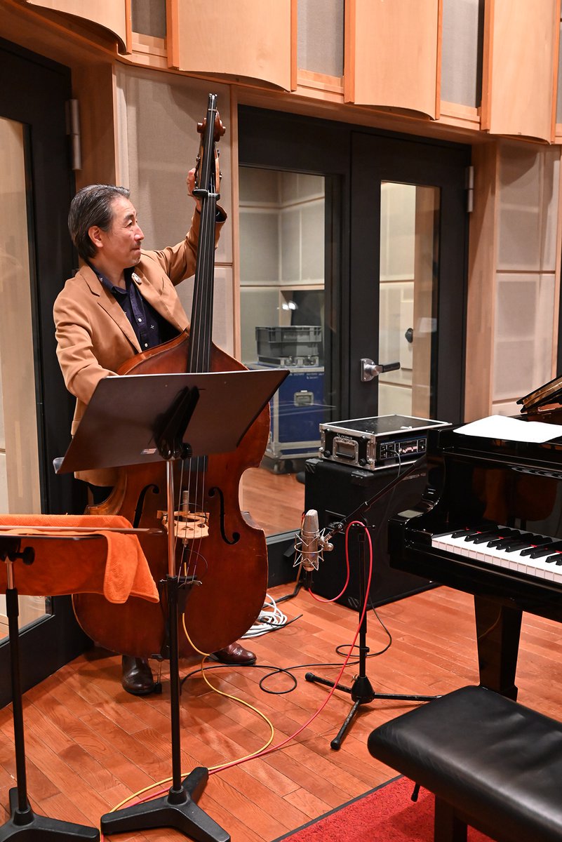 6曲を収録し終えたところで一旦休憩。スタジオからコントロールルームに移動すると、こちらでは今“録ったばかり”のプレイバックがDYNAUDIOのモニタースピーカーから再生されている。これは面白い!まさに今、生で聴いたばかりの音が、録音機材を通ってそのままに再現されてくる。山本のピアノはどこまでも瑞々しく、香川のベースの重みは太くそれでいてしなやかに音楽を支える。目の前で時間が巻き戻ったかのような、衝撃の体験である。
