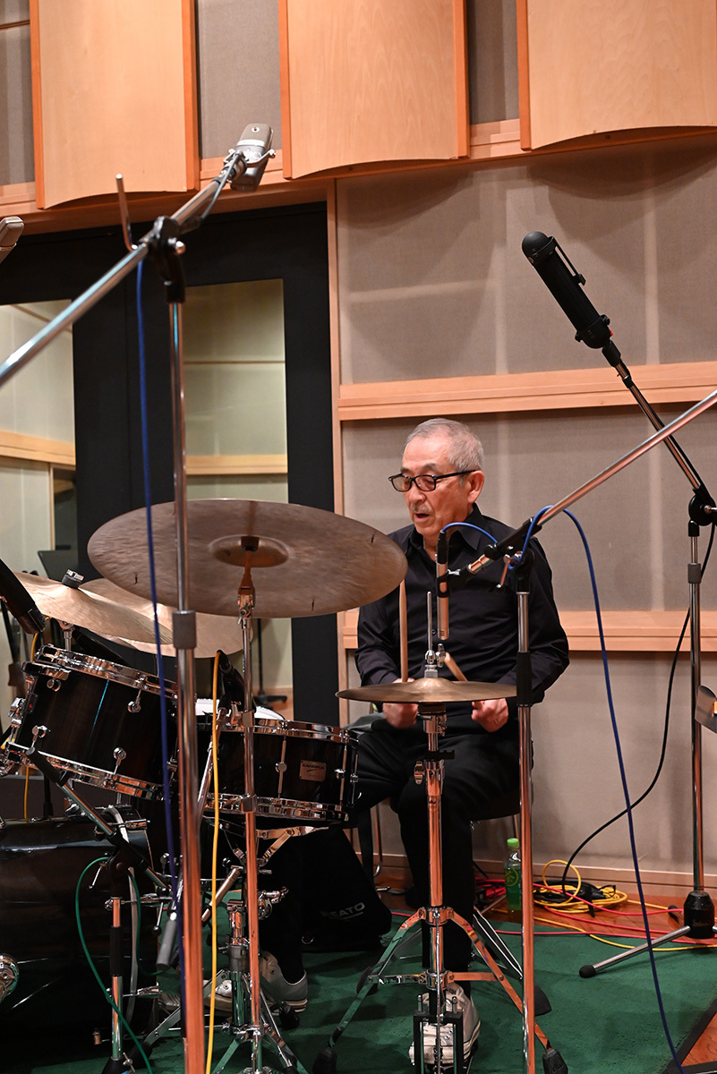 厳密に言えば、もちろんやはり“生音”と録音された音は違う。特に大隅のドラムは、ブラシやスティックを使い分け、そのたびごとに新鮮な音を繰り出してくる。スティックも頭かおしりか、どちらで叩くかによって音は全く違ってくる。そんな微細なニュアンスが、録音でどこまで再現できているか…。打楽器の瞬発的な立ち上がりや余韻の残り方など、“録音・再生の難しさ”について改めて教えてくれる。