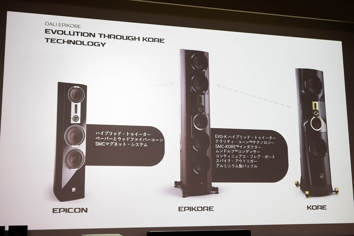 続けて、シニアサウンドマネージャーの澤田龍一氏が、DALIの技術の詳細を解説。今回登場した3モデル(そして既発売の「EPIKORE 11」にも)共通する大きな特徴は、「EVO-Kハイブリッド・トゥイーター」の搭載となる。EVO-Kとは「KORE」からのEVOLUTION(進化)という意味が込められており、大型の35mmドームトゥイーターと、プレーナー・トゥイーターを組み合わせたものとなる。ちなみにプレーナー・トゥイーターは、これまで同社が“リボン・トゥイーター”と呼んでいたものの、呼び方を変更したものとなる。