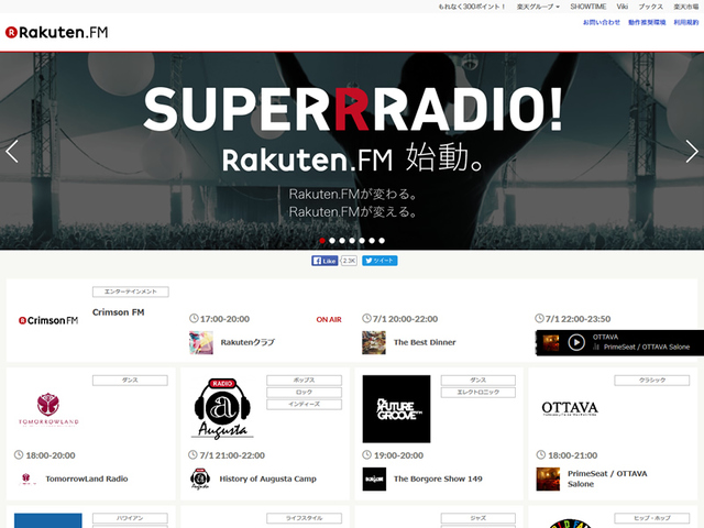 「Rakuten.FM」は、iOS版とAndroid版アプリ、ブラウザのウェブサイトから、様々なジャンルの音楽やトーク番組を、インターネットを通じて無料で聴くことができるインターネットラジオ配信プラットフォーム。計20局でサービスインし、OTTAVAなど楽天以外からもコンテンツホルダーが参画している。