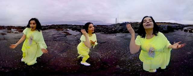 VRヘッドセットとヘッドホンを身につけると、周囲の環境からは完全に遮断され、寒々とした海岸の風景のなかにいることに気づく。黄色いワンピースと髪の毛をなびかせながら視界の端から端へ自由に舞うビョークの姿をひたすら追いかけることもできれば、視点を一点に定めてぼんやりと海岸を眺めることもできる。そしてサビではビョークが「Who is open?...」と真っ正面から歌いかけてきて、目の前で彼女の独白を聞くような心地になった。