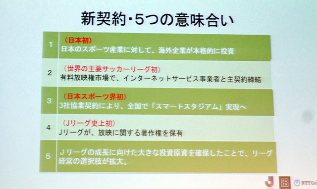 5つめは、今回の大型契約を結んだことで、Jリーグの成長に向けた成長原資を確保したこと。これをうまく活用することでリーグ経営の選択肢が広がるとした。