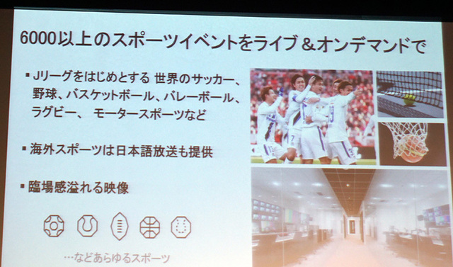 DAZNについては上述のとおり2016年夏にサービスを開始し、6,000以上のスポーツイベントをライブ&オンデマンドで提供していく。スマートフォンなどを含めたマルチデバイス対応の配信を「魅力的な価格で」提供すると紹介した。