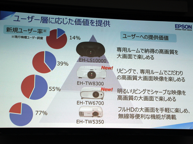 そういった市場背景のもとに、エプソンでは今回の新製品2機種を含めた液晶プロジェクター現行4機種をラインナップし、様々なユーザーの映像視聴スタイルに合わせたプロジェクターの価値を提供していく。