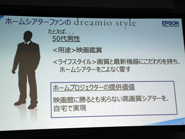 エプソンの掲げる「dreamio style」とは、現在の多様化した視聴デバイスや映像コンテンツをプロジェクターと連携させることで、ユーザーによって異なる映像視聴スタイルそれぞれに対応し、ユーザーのライフスタイルの中に“大画面”の楽しさを付加していくこと。