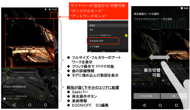 アートワークモード時における各モデル固有の機能として、DP-X1ではフリック操作による早送り/巻き戻しの操作が可能となった。XDP-100Rにおいてはアートワーク表示の明・暗の一発切り替えが行えるようになった。