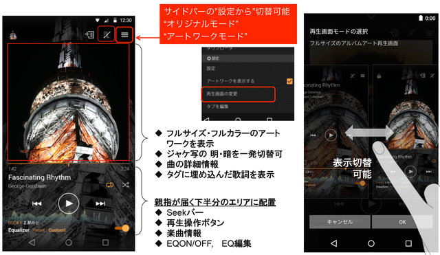 画面の操作性も改善され、SEEKバーや再生操作ボタン、楽曲情報、EQのON/OFFや編集のボタンを親指が届く画面下半分のエリアに配置した。
