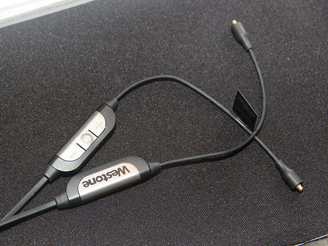 テックウインドのブースでは、同社が取り扱うWestoneから、通常のイヤホンをBluetooth対応にするアダプター付きMMCXリケーブル「Westone Bluetoothケーブル」が出展されていた。先日リリースされたばかりの製品で、本日30日から販売を開始している。