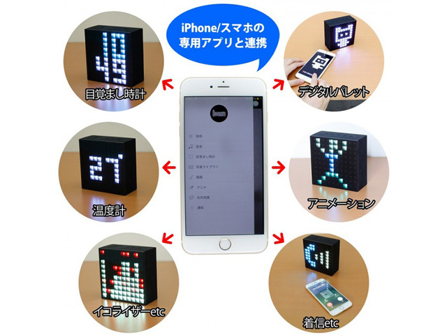 本機は、本体の前面に100個のLEDライトを搭載することが特徴。専用アプリをインストールしたiOS7.0以降のiPhone/iPadまたはAndroid4.3以降のスマホ/タブレットと連携することで、ユーザーが作成したドット絵風のアニメーションや、音楽に合わせて動くイコライザー画面、時計・温度などをLEDライトによる絵で表示することができる。