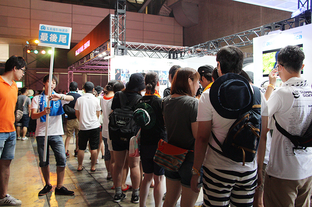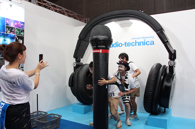また、オーディオテクニカブースの名物企画である、写真撮影でヘッドホンが当たる大抽選会はもちろん今年も開催され、参加を待つ長蛇の列もできていた。毎年訪れる来場者もいるほどの人気で、本企画も初日から500人以上訪れたとのことだ。ヘッドホンの巨大オブジェの下で、こちらも巨大なマイクロフォンのオブジェと一緒に、思い思いのポージングで写真撮影を楽しんでいた。