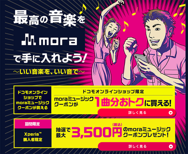 また、本日29日から期間限定で、Xperia購入者を対象としたキャンペーンも開始している。期間中にドコモオンラインショップにて対象のXperiaを購入した先着2,000名に、最大3,500円までの楽曲と交換できるmoraミュージッククーポンが当たる。キャンペーンの対象となる機種や応募方法などは、ドコモオンラインショップのキャンペーンページで確認できる。