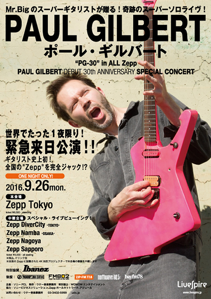 世界的ロックバンド“Mr.BIG”のギタリスト/ソロ・アーティストとして活躍し、今年アルバムデビュー30周年を迎えるポール・ギルバート氏の特別記念公演が、9月26日(月)に開催。4K対応プロジェクターを使用し、本公演会場となるZepp東京から全国のZepp会場に同時生中継も行われる。