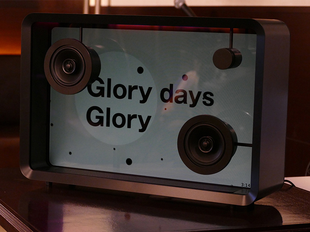 “歌詞を味わうためのスピーカー”として、筐体に面発光の透過スクリーンを採用し、歌詞をモーショングラフィックとして表示する。歌詞/曲調を自動解析するデータベースにそれぞれ接続し、楽曲に合わせたフォントや動きを反映させることで歌詞の魅力を楽しめるとしている。